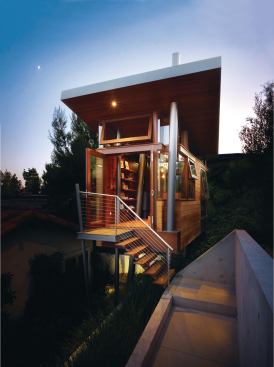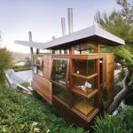 Designed for a Los Angeles artist, the tree house looks like a piece of sculpture. But it’s a completely habitable one. At 172 square feet, it’s the kind of peaceful hideaway many people dream of: a studio that’s a perfect spot to go draw, write, read, or just take a nap. The place has electricity, not to mention a powder room, outdoor shower, and sprinkler system (the tree house is in a fire-prone area). Running water is possible thanks to those canted steel support columns—they’re hollow and do double duty as plumbing pipes.