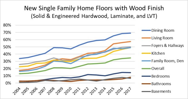 Each of HIRL’s reports break flooring surfaces down by rooms in the home. As of 2017, carpet was installed mostly in basements and bedrooms and wood has dominated dining rooms, living rooms, foyers and hallways, and kitchens.