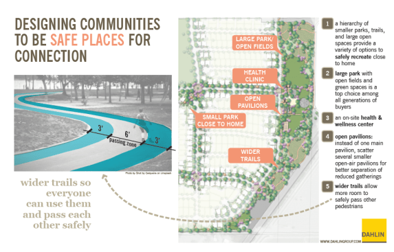 Outdoor suggestions include wider trail paths, a minimum of 12 feet wide, that can accommodate passing lanes and social distancing; large parks and open spaces supplemented by smaller parks and trails; multiple open-air pavilions in place of one large event pavilion; private patios and balconies in units; and on-site health and wellness centers for residents.