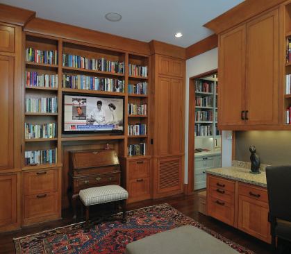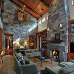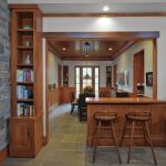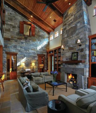Restrained Details Keeping to a grand lodge style while avoiding a cavernous feeling took some doing. The cove molding throughout is a simple curve without a lot of detailing. Much of the home’s woodwork takes its cues from traditional Shaker style. Doorways lack casings, but each one has a jamb made from plantation-farmed Douglas fir, says Davidson. She acknowledges that such a soft wood isn’t practical for families with young kids, but for the empty-nester couple, it’s fine. Sheetrock surrounding door jambs and built-ins is bull-nosed, rather than a crisp, hard corner. This creates a friendly softness.