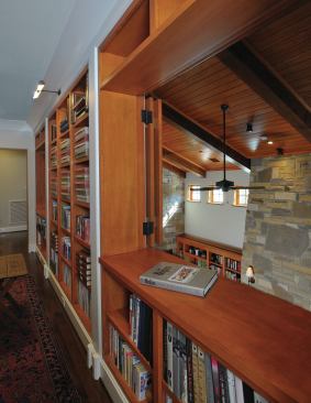 Useful Circulation Spaces Hallways house bookshelves and art. The upstairs hall looks onto the great room, and it’s a cozy place to sit and read, with shutters that can be closed for privacy.
