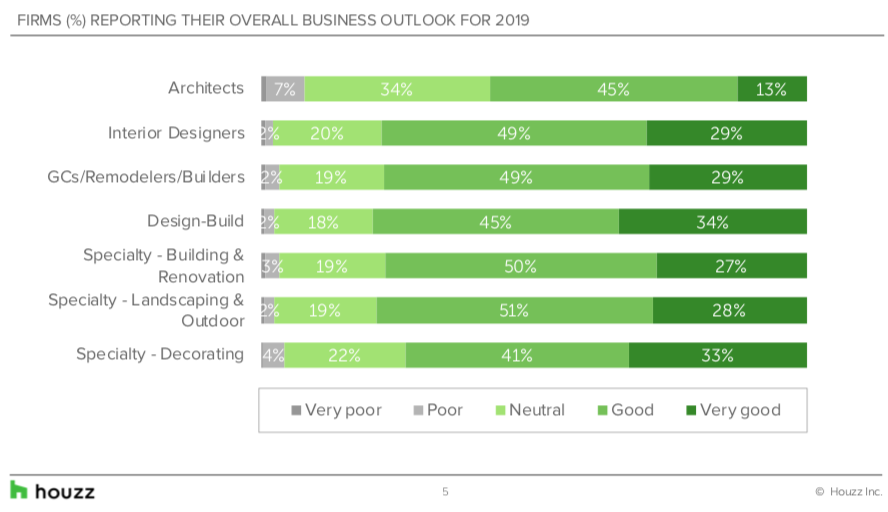The State of the Industry released by Houzz compiled answers from 4,780 firms with Houzz profiles that offer services primarily related to residential renovation and design. The survey included 1,069 remodelers, 537 design-build firms, and 679 architects and was fielded between December 2018 and January 2019.