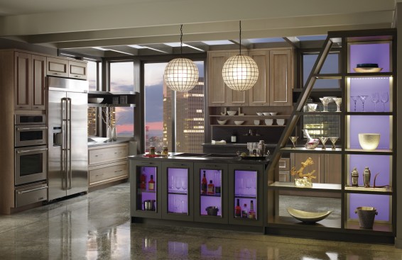 Colorful backlighting is a quick way to refresh built-ins and keep living spaces on-trend. “Deep purples break the barrier of primarily feminine appeal, and broaden its usability into a darker, sophisticated jewel-tone realm. Pantone’s Ultra Violet encompasses these traits as well as an energetic electricity to add more personality to the home,” says Stephanie Pierce, director of design and trends at MasterBrand Cabinets. www.masterbrand.com