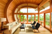 Recently, Wagner designed several cabins built by One-Cut Construction across 140 acres of former farmland in Wisconsin. The main cabin is sited in the secluded woodland, which “allows for a generous use of glass providing abundant daylight and an immersive connection with nature,” he says. Many rooms in the cabin feature corner windows that frame panoramic vistas.