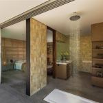 Sliding glass walls, steel louvers, and limestone flooring blur …