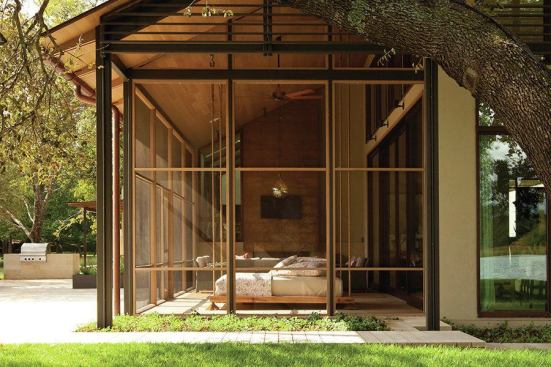 Sliding glass walls, steel louvers, and limestone flooring blur the lines between the living room and porch.