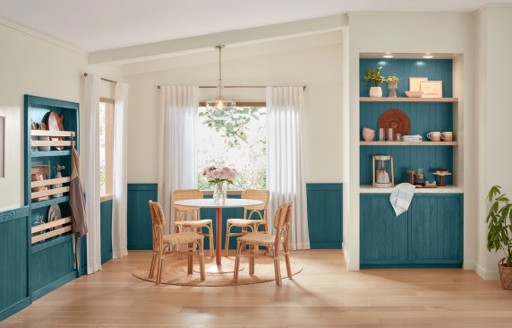 “Bay Blue is at the intersection of contemporary and classic,” says Sue Kim, director of color marketing for Minwax. “The 2024 Color of the Year is a rich shade that elevates and enhances the natural wood within our homes.”