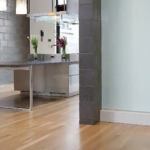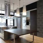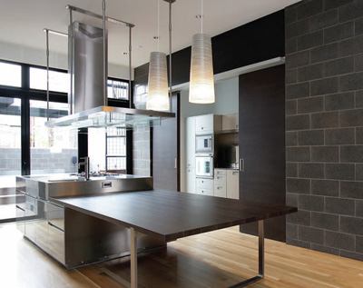 The feeling of an open, seamless connection between indoors and outdoors is enhanced with the integration of exterior materials, such as gray cinder block, into the kitchen. But function is not sacrificed for beauty in this culinary work-space. Its brawny range hood is all business, and sliding wood veneer doors offer a convenient way to conceal meal-prep mess on the sink and cabinet side of the room.