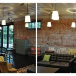 Hanging from the restored ceiling are off-the-shelf floorlamps that were re-rigged as pendants.
