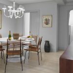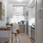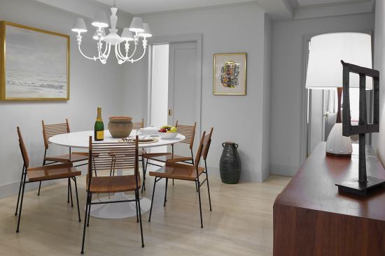 The existing kitchen had dark finishes, a dropped ceiling, and a dysfunctional layout. It didn’t help that the apartment faces north and the kitchen is the most interior space. Design Development’s strategy was to brighten the room with bleached oak floors, reflective stainless steel appliances, glossy white cabinets, and white marble countertops and backsplashes. The design team paired that cool palette with a buffet-height walnut ledge that adds warmth into the space. “It can serve the dining room to the left or as an eating surface where you can sit and have a bagel,” Brian says.