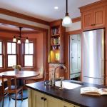 To ensure that the kitchen cabinets were right at home in this early 20th-century dwelling, the details and material draw right from the house, says Mark. In particular, he and Jean took design cues from a built-in oak buffet in the dining room. The beadboard soffit over the cooktop matches the cabinets, makes the scale cozier, and adds a timeworn flavor. So do soapstone countertops, which “melt in and immediately look old,” Jean says. Offsetting the deep colors is a warm yellow backsplash, with tiles made locally in Minneapolis, and a white-slatted pantry door reminiscent of the corn cribs common to Midwestern farms. A breakfast nook was set near the windows, taking advantage of the daylight. This warm, cheery kitchen is more than hard-working: It’s a beloved family hangout.