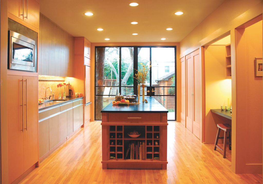 Duncan stole an adjacent hallway to create a galley kitchen wide enough for the owners to walk on both sides of the center island. One end of the room segues directly into dining. The kitchen’s opposite wall consists of 8 feet by 10 feet of steel and glass that infuses the room with daylight and opens it to the deck and yard. Three sets of retractable doors line the wall opposite the sink, concealing a computer workstation, laundry, and water heater. Fir is the wood of choice for all custom cabinetry. Duncan hand picked all the wood, which was carefully cut so that the distinctive grain all flows the same direction. “We didn’t want elaborate detail,” Duncan says, “but what we did do, we wanted … to show off.”