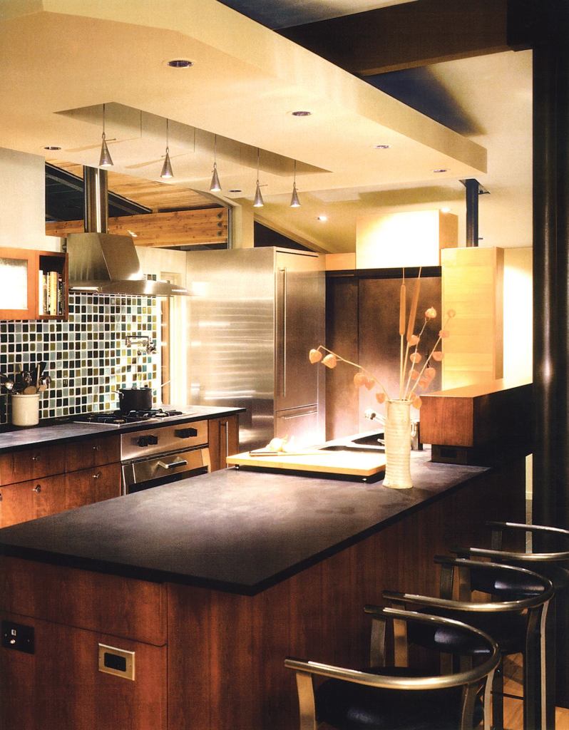 The judges particularly praised the architect’s “sensitive and artistic use of materials.” Dark-stained cherry cabinetry is topped with a matte black Richlite countertop (a composite material made of paper fiber). The warmth of the cabinetry contrasts with stainless steel appliances, a custom stainless surround that trims out the built-in refrigerator, and a steel sliding door to a small pantry that borrows a bit of space from the entry foyer. The room gains texture from recycled-glass tiles and a sculptural stucco wall. The wall’s deep window augments natural light that filters in from a clerestory. The dropped ceiling over the kitchen reinforces its boundaries and contains recessed and pendant lights that make certain this jewel-like kitchen is always in the spotlight.