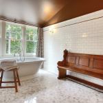 Subway tiles cover the backsplash as well as the wall between the upper cabinets and ceiling, creating a finished look. The tiles reappear in the butler’s pantry, which features identical custom cabinetry profiles to those used in the kitchen, just painted in a different color. “We wanted to help unify the house by picking a few things I would stick with throughout,” Evans explains. Accordingly, the master bath also has subway-tiled walls and those same cabinetry profiles, this time executed in walnut. Chocolate-brown paint coats the bath’s upper walls and sloped ceilings. “When you’re in the tub looking up, you feel like you’re in a vat of chocolate syrup,” she says.