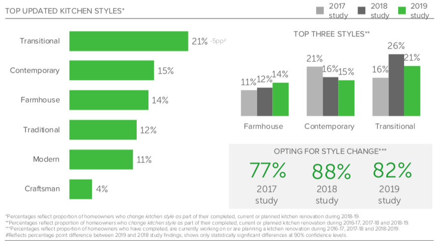 Houzz also found that over 80% of renovating kitchen owners change their kitchen’s style, with farmhouse style nearly rivaling contemporary as the second-most popular style choice. Farmhouse style’s popularity has steadily grown since 2017, while contemporary style’s market share has declined to 15% from 21% in the past three years. Transitional remains as the most popular style for kitchens.