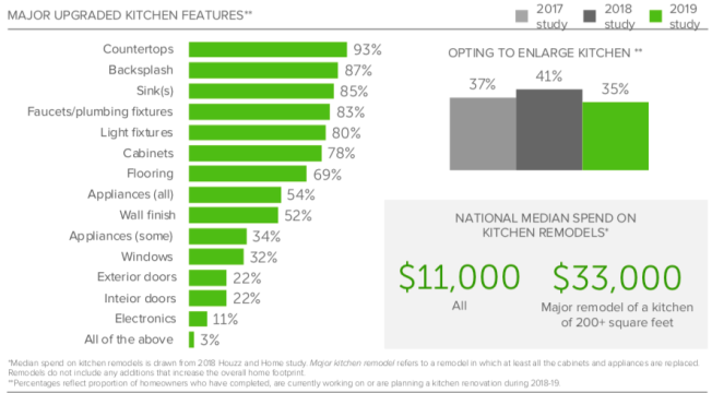 The Houzz survey finds that Kitchen renovations are less likely to be motivated by pent-up demand than in recent years. Renovators motivated because they “can no longer stand the old kitchen” or “finally have the means” to renovate continue to decline year over year. In contrast, renovators are more likely to be motivated by their desire to update a recent home purchase. One in three kitchen renovators enlarge their kitchen during renovations, down six percentage points from Houzz’s 2018 study.
