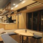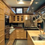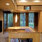Knowing exactly what the clients wanted allowed De Vido to create a highly custom solution that addresses both functionality and ambience. A butcher block-topped island contains back-to-back sinks. One is across from the oven and fridge in an ideal spot for food prep, while the other faces dining areas for easy rinsing and placement in the adjacent dishwasher. A double-sided pot rack—designed by the architect—hangs above. Swiveling spotlights flank the unit to put direct light wherever it’s needed. The rack’s supporting wood pieces evoke a subtle Japanese aesthetic, as does trimwork linking the clerestory windows. And their dark wood contrasts handsomely with the pale maple cabinetry.