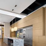The resulting build-out celebrates sheer volume with a kitchen/living/dining room Walker describes as resembling “a big Italian courtyard. Everything opens off of that space.” A long wall clad in Koto wood panels forms the inboard boundary of the room. “The kitchen kind of embeds itself into that wall,” says Walker, who set the kitchen apart from its wood surround with a grayscale palette of stone counters, laminate cabinets, and stainless steel appliances and accents. Dark-stained bamboo floors underscore the room’s scale.