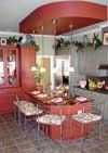 To reinforce the open plan, the same flooring—a stone-like ceramic from Dal-Tile—continues from the entry to the kitchen and into the adjoining family room. That forgiving gray floor color is carried through to the maple kitchen cabinets, which have been treated with a gray-green Sherwin-Williams exterior stain, and to the stainless appliances and backsplash. But just so things don’t disappear into a dim fog, bright punches of Chinese red accent the island, ceiling furr-down, and nearby hutch/pantry. Red might not be everyone’s idea of a kitchen color, but it sure adds a bit of drama.