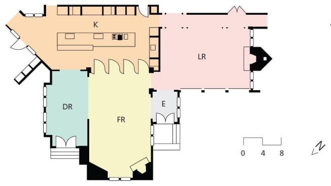 By removing a few walls, Gurney transformed the original cramped kitchen, lost in the center of the house, into the hub of the home. The new kitchen stretches to fill an awkward, oversized hall that was wasted space and in the process gains more interaction with the family room and dining room. A small closet behind the kitchen was expanded to accommodate a pantry and small catering kitchen.
