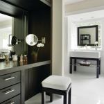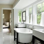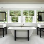 Hutker and project architect Matthew Schiffer popped part of the bath out past the home’s east wall, creating a bay window that brings in extra natural light. Privacy wasn’t an issue, thanks to the lush grove of evergreens on that edge of the yard. “When you’re standing there at the vanity, you have the experience of being more outside than inside,” Hutker says. He and Schiffer distilled the interior architecture to its essence so as not to distract from this feeling, using the simplest trim and detailing possible. A suite of Waterworks fixtures matches the room’s clean lines and allows light and air to flow under the sinks and tub surround. “We were trying to express everything as being furniture and movable,” Schiffer says. A built-in custom dressing table of stained, rift-sawn oak complements the fixtures while keeping to the minimal aesthetic.