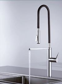 The Ono faucet features a flexible spring hose that swivels 360 degrees; an operating lever made of thin, hardened stainless steel; and a wear-resistant flat-topped spout. KWC America. 678.334.2121. www.kwcamerica.com.