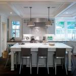 Good proportions, elegant details, and a simple color palette make this kitchen the crown jewel of a new house in an old Minneapolis neighborhood. Its cool, monochromatic color scheme is a quiet foil for the well-defined millwork and the cabinetry’s varied vertical planes. Ceiling beams, upper cabinets, and the range hood are all centered on the island, which anchors the room. Wrapping the corner at the sink are large windows, which let in southwestern light and a long, borrowed view of the neighbors’ backyards.