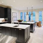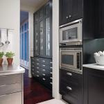 Dual islands allow for multiple cooks and entertaining stations. The island closest to the dining area features an ice maker, wine cooler, and a place for stools. The working island near the range has a prep sink and storage for pots and pans, while the nearby butler’s pantry holds an extensive collection of china, glassware, and silverware.