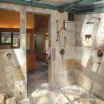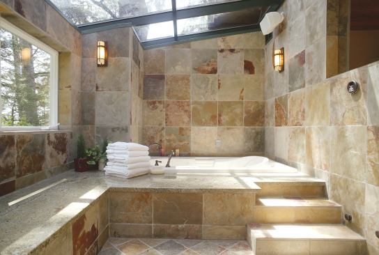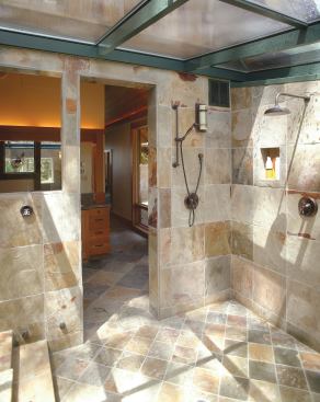 Edwards’ U-shaped house plan, which wraps around a large patio, locates the bath at the end of the master bedroom wing, with access to an outdoor hot tub and fire pit. The tub-and-shower room occupies a glass-roofed volume that projects from a gable end. Slate tile walls and a granite tile floor make the area moisture-proof. “That entire room can be flooded with steam,” Edwards says. “The platform and the floor are heated, so they can do their morning stretches on that heated slab. It’s got a sound system piped into it. It’s got dimmable lighting controls to change the mood.” The shower fixtures include two hand wands and a rain head. A TV mounted in the dry area is visible through an interior window (not yet installed when the bath was photographed) and audible via the sound system. The view to the outdoors is even better. “They’ve got big spruce trees right above them,” Edwards says. “From the tub you can look through the forest to the river below. The windows open, so you can get that great salt smell coming in. The whole idea was to get the whole damp, forest feeling, but in a very warm way.”