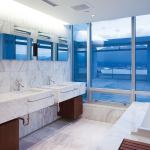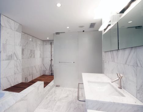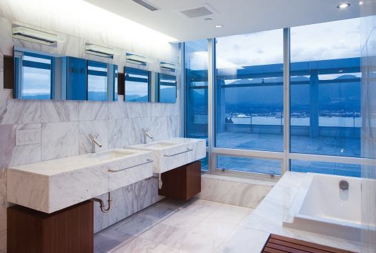 The last thing this master bathroom needed was more visual drama. Located on the 19th floor of a luxury high-rise in downtown Vancouver, B.C., the project boasts views across Coal Harbour to evergreen-filled Stanley Park, one of the city’s top attractions. So when charged with creating the unit’s interiors, designer Michelle Biggar introduced a clean, minimalist palette of colors and materials that wouldn’t compete with the striking scenery. “I really like white in a bathroom—it’s just so clean and very minimal,” she says. “It’s a very neutral background for the setting … it doesn’t fight with the view or anything else.”