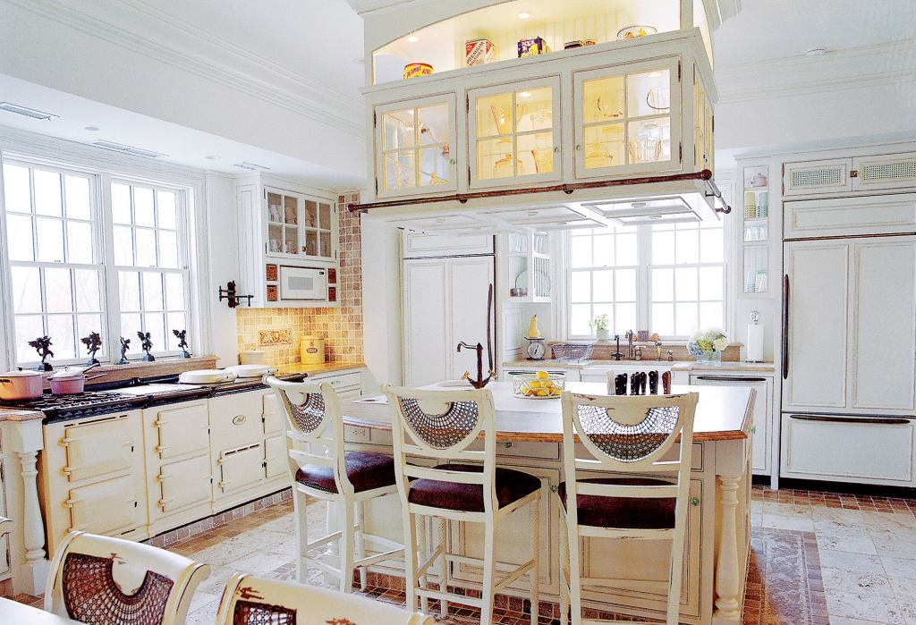 “We didn’t want to walk into this Victorian-style house and see this brand-new, state-of-the-art kitchen,” says Miriam Weinreb Lissak, who designed the interiors for this new home on Candlewood Lake in New Fairfield, Conn. The family of six who own the house does need state-of-the-art function for daily meals and frequent social events, however. “You can have a catering staff all working at once or one person cooking for the family,” adds Lissak. Two refrigerators, two dishwashers, and a roomy farmhouse sink occupy one wall. A commercial-size, cast iron stove take up almost the entire adjacent wall which offers the cook direct views of the lake. Across the room, a wood-burning fireplace at cabinet height can be seen clearly from anywhere in the room.