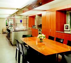 Details Laboratory-like vitrines of steel and glass top the island, supplying extra storage space as well as blocking noise. “When caterers are in the kitchen, you don’t hear them in the dining room,” says project architect Joy Meek.