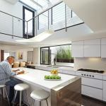 “By combining the duplex units, we were able to create vistas through the project,” Teiger says. “That allowed light to enter all the way around and fill what would have been a dark area of the house.” Bookended by neighboring houses, the kitchen opens onto a bamboo-screened deck and to the sky, via wall and roof windows above. White lacquer cabinets and quartz composite counters—bracketed with granite slabs at the island—make the most of the abundant natural light, creating what one judge called “a catalyst for gathering.”