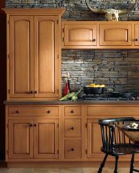 The Saddle Chic kitchen uses flush inset Vintage and Singleton door styles in maple with a chocolate frost. Base cabinetry and two columns of apothecary drawers provide storage, along with two Tallers on both sides of the cooktop. Matching doors hide the range hood while glass-fronted cabinets show stored items. 800.447.9006. www.plainfancycabinetry.com