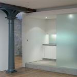 As warehouses go, the buildings are unusually ornate, with thick limestone walls, timber floors, and fluted cast iron columns. Responding to their heft, the architects kept the palette of materials to a minimum, choosing just a few robust, reflective materials that complement the building’s colors and textures. In a nod to the modern-day penchant for socializing around the cooktop, the kitchen directly faces the living room, though fixed-glass screens partially separate the two rooms, admitting light while editing views. Defined also by a level change and a clear limestone floor, the kitchen runs along just one wall and is completely devoid of distracting details. The work surface and integrated sink are made of stainless steel that’s been shot-blasted for a slightly matte finish. Electrical sockets are hidden from view under the front edge of the cupboards, which are constructed of MDF spray-painted to a hard finish. The light-reflecting backsplash provides another antidote to the heaviness of the building. It’s made of glass that has been spray-painted on the back with white enamel.