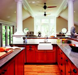 Architect Tony Terry’s strategy for this Branford, Conn., kitchen involved a little sleight of hand. The main design concept was simple enough. He cut into the ceiling of the 1959 Colonial’s one-story addition to make a double-height kitchen and family room. Then he defined the kitchen area using four clasically inspired pillars rather than the usual solid walls.