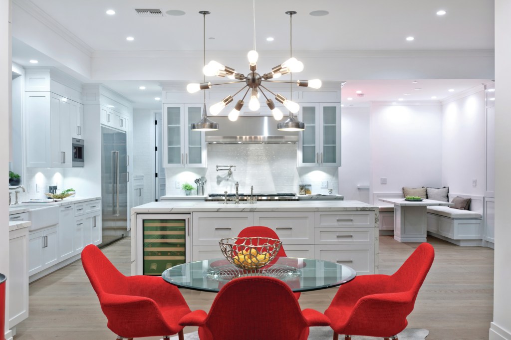 “We created a banquette in the corner of the room, as well as a formal breakfast nook for the adults,” says Akef. “The original idea was to put a bar where the banquette is, but we felt that was less family-oriented. You don’t need a bar every day, and so we wanted to offer a more functional, usable space for the whole family.”
