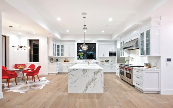 “A lot of builders and developers will say that you have to follow the triangle,” says Akef, referring to a floor plan that connects the cooktop, sink, and refrigerator. “Instead we put the fridge off to the side so that the waterfall island could be the centerpiece. It’s where everyone congregates around, so we wanted to create as much open space around the island as possible.”