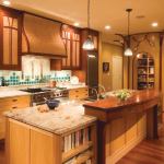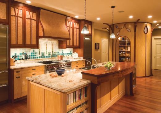 Prima vera also makes up the room’s base cabinet doors and drawerfronts, while the wall cabinets consist of quilted maple doors with sapele framework and accents. “Dawn has a remarkable appreciation for woods,” says Reidt. “The whole project is really a celebration of that material.” Arts & Crafts details on the wall cabinet doors are borrowed from the 1908 Greene & Greene-designed Gamble House in Pasadena, Calif. A carved sapele breakfast bar rises up over the granite island countertop to supply a casual dining spot for Epstein, her husband, and their daughter. And a freestanding hutch and built-in corner cabinet, along with the rest of the woodwork, relate to some of Epstein’s furniture pieces. “Paul drew out my aesthetic in the cabinetry,” she says.