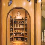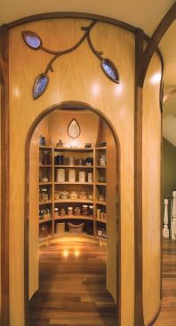 The new room’s most striking aspect is its circular pantry, detailed to look like an enormous tree trunk. Prima vera, a blond tropical hardwood, forms the tree’s “bark,” while sapele comprises the leaf and branch details. Slumped glass fills in the leaves, transmitting light from inside the pantry. “It’s a magical, magical spot,” says Epstein. “For all its aesthetic interest, the pantry is also functional—everything is right out in front of you.”