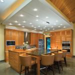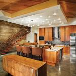 The basalt wall and its sinuous bronze railing, also sculpted by Higgs, help make the kitchen into a visually interesting space. A ceiling cloud serves the same purpose, as does the three-level island directly underneath it. Cherry tops the island’s highest portion, while a slab of labradorite covers the middle level, which serves as a casual dining spot. The owners use the lowest part of the island as a food prep area, so Schimberg surfaced it with low-maintenance Silestone. Cherry cabinetry and a recycled-glass tile backsplash supply a simple, clean-lined background for these more dramatic elements.