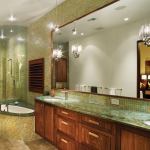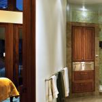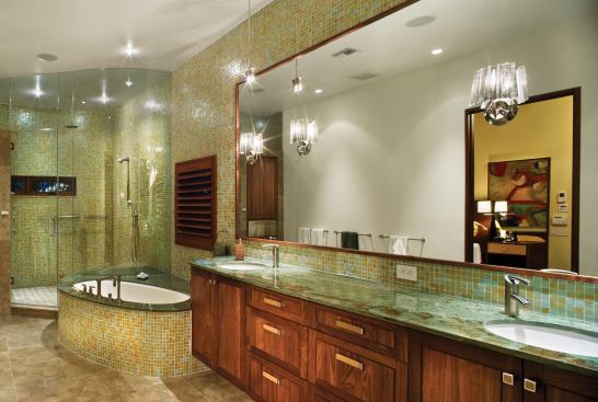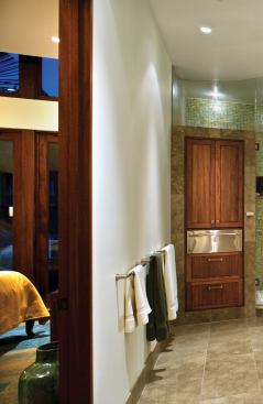 Recycled-glass tile also figures largely in the master bath, where it lines the walls and bathtub surround. Schimberg bucked the popular trend of large master baths with little separation from the bedroom, instead designing a medium-sized bath with full-height walls and a single door. “The concept was more about creating a private, serene space,” he says. “It’s not a big, open master bath.” To offset the room’s shape—a long, narrow rectangle—he added rounded features such as a gently S-shaped glass shower wall, an elliptical tub deck, and a curved vanity. The tub deck continues into the steam shower to serve as a seating area, and it also touches the vanity cabinetry. “The idea is to have this amorphic, continuous shape throughout this very long, linear box,” Schimberg explains. The bath’s relatively modest size doesn’t preclude touches of luxury: Thoughtfully placed windows allow water views and natural lighting without compromising privacy, while a stainless steel warming drawer holds hot towels at the ready.