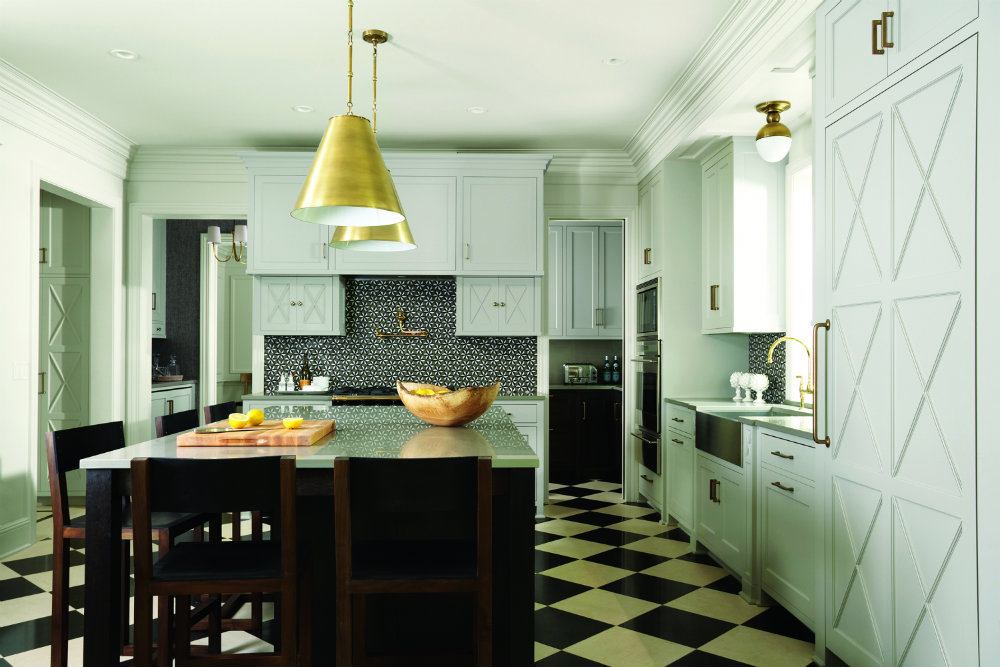 The judges commended this kitchen’s sense of luxury, its fearless use of pattern, and its sense of fun. In combining a lively tile backsplash (a mix of honed stone and marble), a black and white tile floor, and accents of gold on the cabinet hardware and plumbing and light fixtures, this project team created “a brave moment,” said the jury. Well-proportioned wall cabinets that vary in scale help hold the room together. This kitchen supports a bold and commanding choice of materials that could easily look overdone.