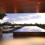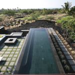 Once visitors have parked in the motor court, they enter the hallway, a long spine that acts as a spacious outdoor foyer before tipping slowly into a zero-edge reflecting pool. The hallway sits off-axis on the linear lot, pointing toward views of the ocean to the west and a volcanic mountain range to the east, while the glassy pods and private lanais zigzag around it.
