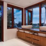 Inside, the living room’s billowing ceiling, digitally cut from an off-the-shelf glulam beam, is an abstracted grass skirt and a nod to the island’s wood-carving tradition. In the master bedroom, the headboard and ceiling suggest palm trees. The mosaic on the powder room wall is computer-generated, too. Belzberg used a pixilated photo of the client’s favorite orchid to model the location of the tiles.