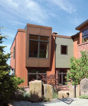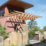 A wall of basalt boulders gives the house a measure of privacy. The entry tower, trellis, and copper-sheathed bay window help define the front façade.