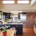 Clerestory windows bestow generous natural light on the interiors. An exposed brick wall in the kitchen pays tribute to the original house.