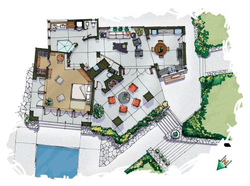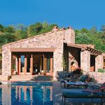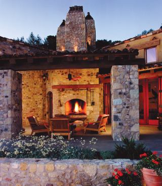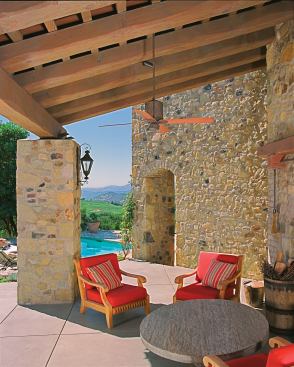 Inspired by the farmhouses of Tuscany, the little stone house is only 1,200 square feet, but it is designed to live large, opening up almost completely with oversized bi-fold and French doors to the surrounding concrete terrace that is the home’s true living room. Here are the fireplace and sitting area under a trellis, with the pool and outdoor shower just outside the bedroom doors. A colonnade adjacent to the terrace and near the kitchen serves as an al fresco dining room. It leads to an overlook where the owner can survey his domain, starting with the vineyard that yielded most of the stones used to build the cottage and the retaining walls. From the overlook, the walk leads down to the guest-house, hot tub, and bocci ball court. The court is built to true Italian specs, Aiello says, with a crushed oyster shell surface and perfect drainage.