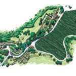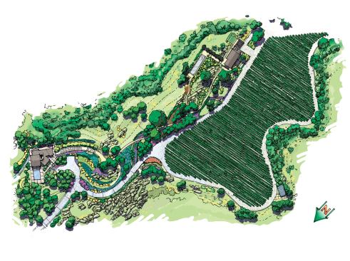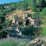Scattered throughout a habitable 10-acre section of the steep, rocky property, the destinations were gradually added as the owner discovered a need and a site for them. “As the land developed the buildings developed with them,” explains architect Mario Aiello. First the large hillside vineyard was planted. That was followed by a guesthouse designed to appear to be a converted barn. Then came a gym on the far edge of the vineyard. Recently, a wine storage facility was added, including a patio where the owner can enjoy a bottle of his own wine with guests.