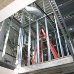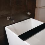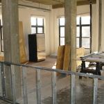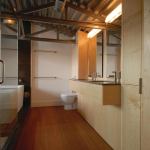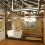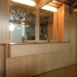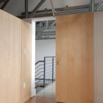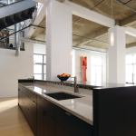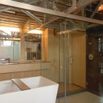 Upstairs, the loft’s dramatic exposed roof structure is offset with white walls and simple maple casework, which defines sleeping, dressing, and bathing areas, as well as a music library. The icing on top is a double-wide roof deck overlooking the romantic cupolas, spires, and monuments of Washington.